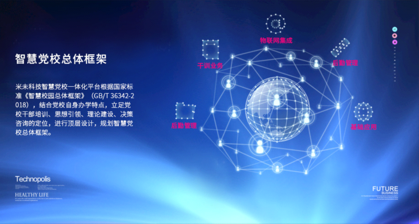 米未科技智慧党校一体化平台根据国家标准《智慧校园总体框架》(GB/T 36342-2018),结合党校自身办学特点,立足党校干部培训、思想引领、理论建设、决策咨询的定位,进行顶层设计,规划智慧党校总体框架。包含基础应用平台、干训业务平台、行政管理平台、后勤管理平台、物联网集成平台五大平台,将教学、科研、行政、咨询和党校智慧化服务和管理进行充分融合,各平台系统间信息互通互联、资源共建共享,真正意义上实现“一体化、智慧化、集成化、数字化”,同时能够节约建设成本,避免重复建设和资金浪费。