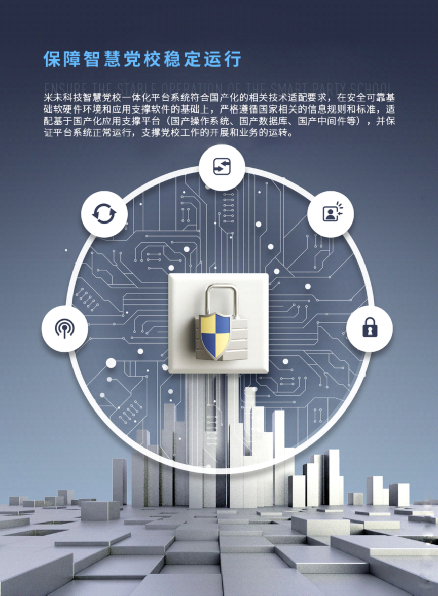 米未科技智慧党校一体化平台系统符合国产化的相关技术适配要求,在安全可靠基础软硬件环境和应用支撑软件的基础上,严格遵循国家相关的信息规则和标准,适配基于国产化应用支撑平台(国产操作系统、国产数据库、国产中间件等),并保证平台系统正常运行,支撑党校工作的开展和业务的运转。