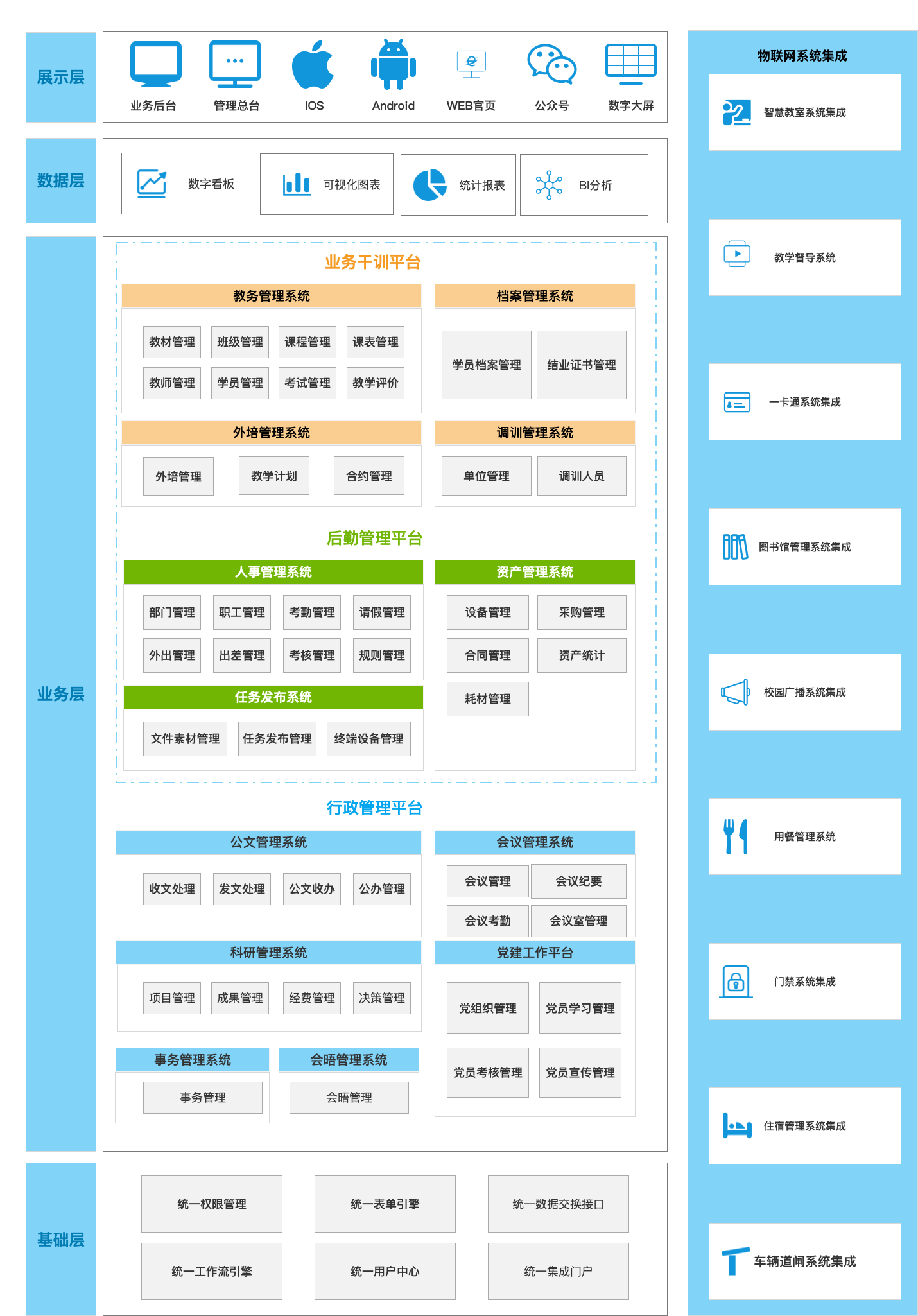 根据党校整体工作实际情况,智慧党校一体化平台包含基础应用平台、干训业务平台、行政管理平台、后勤管理平台、物联网集成平台五大平台。
